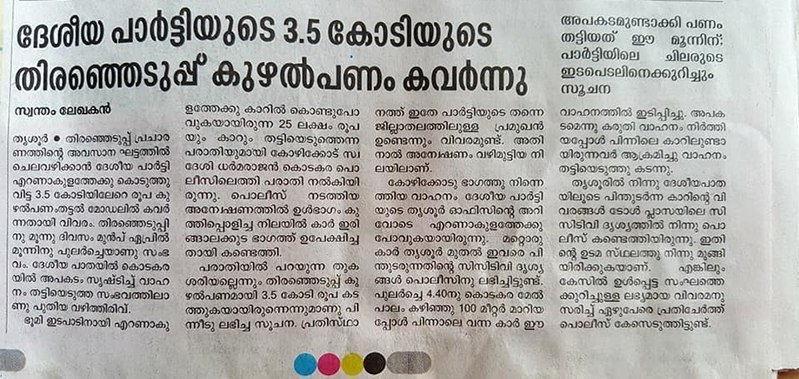 മലയാള മനോരമയില്‍ ഇന്നലേയും ഇന്നും വന്ന രണ്ടുവാര്‍ത്തകളാണിത്. വിഷയം ഒരു രാഷ്ട്രീയ പാര്‍ട്ടിയുടെ 3.5 കോടിയുടെ കുഴല്‍പണം ഹൈവേയില്‍ വെച്ച് കവര്‍ന്നതാണ്. ഏത് പാര്‍ട്ടി ? ‘ദേശീയ പാര്‍ട്ടി’ എന്ന് മനോരമ. പല ദേശീയ പാര്‍ട്ടികളുണ്ടല്ലോ.ഏതാന്ന് പറ മനോരമേ !ഇതിപ്പോള്‍ സ: ശിവദാസമേനോന്‍ പണ്ട് പ്രസംഗങ്ങളില്‍ പറയുന്ന നര്‍മ്മം പോലെയാണ്. ചില സ്ത്രീകള്‍ ബഹുമാനം കൊണ്ട് ഭര്‍ത്താവിന്റെ പേര് പറയില്ലത്രേ.’ കുട്ട്യോള്‍ടഛന്‍’ എന്നേ പറയു.