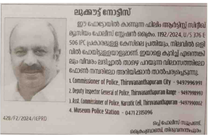 കോടതി മൂന്‍കൂര്‍ ജാമ്യം നിഷേധിച്ചതിന് പിന്നാലെ ഒളിവില്‍ പോയ സിദ്ദിഖിനായി മാധ്യമങ്ങളില്‍ ലുക്കൗട്ട് നോട്ടീസ്.