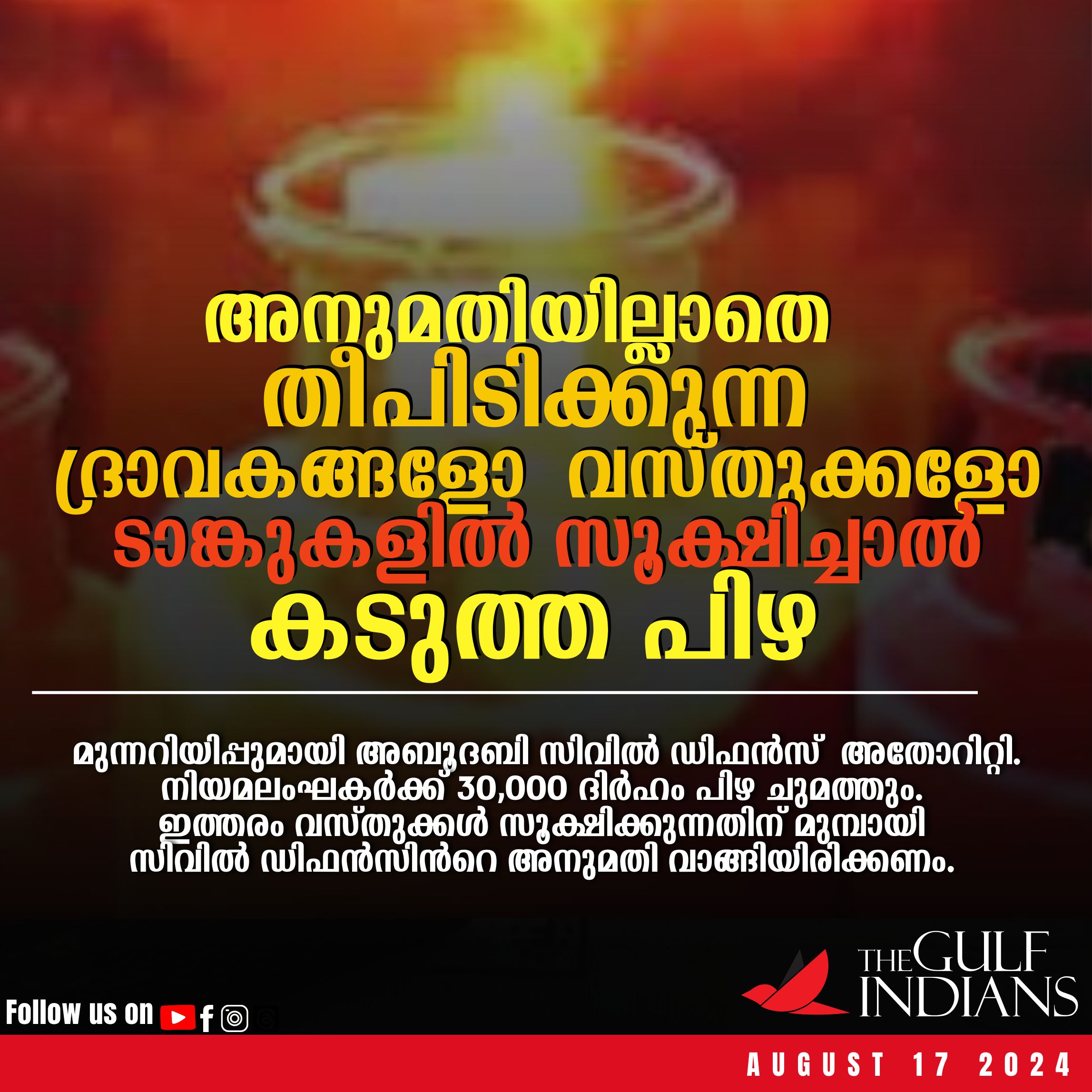 അബുദാബി: അനുമതിയില്ലാതെ തീപിടിക്കുന്ന ദ്രാവകങ്ങളോ വസ്തുക്കളോ ടാങ്കുകളിൽ സൂക്ഷിച്ചാൽ കടുത്ത പിഴ ചുമത്തുമെന്ന മുന്നറിയിപ്പുമായി അബൂദബി സിവിൽ ഡിഫൻസ് അതോറിറ്റി. നിയമലംഘകർക്ക് 30,000 ദിർഹം പിഴ ചുമത്തും. ഇത്തരം വസ്തുക്കൾ സൂക്ഷിക്കുന്നതിന് മുമ്പായി സിവിൽ ഡിഫൻസിൻറെ അനുമതി വാങ്ങിയിരിക്കണം.