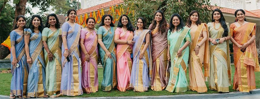 അഭിനിയുടെ ഡിസൈനില് കൂത്താമ്പുള്ളി ശേഖറും സംഘവും വ്യത്യസ്ഥ നിറങ്ങളില് നെയ്തെടുത്ത പു ടവകള് അണിഞ്ഞെത്തി യ അതിഥികള് ചടങ്ങിനെ വര്ണ്ണ ശബളമാക്കി. അന്യം നിന്നു കൊണ്ടിരിക്കുന്ന കൈത്തറിമേഖലയ്ക്ക് മകളുടെ വിവാഹാഘോഷം കൈത്താങ്ങാകണമെന്ന ആഗഹത്തില് നിന്നാണ് ഇത്തരം ഒരാ ശയം രൂപപ്പെട്ടത്. ചടങ്ങിനെത്തിയ ഓരോ അതിഥിയ്ക്കും വ്യത്യസ്തമായ ഡിസൈനിലും വര്ണ്ണ ങ്ങളി ലുമുള്ള പുടവകള് തുന്നിയെടുക്കാന് പ്രശസ്തമായ കൊത്താമ്പുള്ളിയിലെ കലാകാരന്മാരുടെ മാസ ങ്ങള് നീണ്ട പ്രയത്നമാണ് ചടങ്ങിനെ മിഴിവേകിയത്.