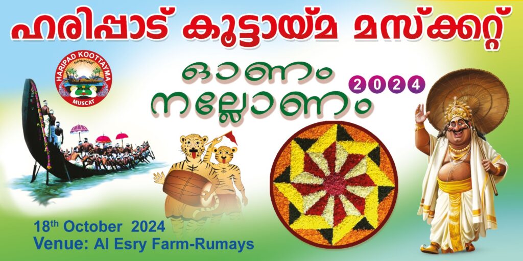 ഇ വർഷത്തെ ഓണാഘോഷവും, രണ്ടാമത് കുടുംബ സംഗമവും 2024 october 18 ന് റുമൈസിലുള്ള Al Esry Farm house ൽ വെച്ച് ഓണംനല്ലോണം-2024 എന്ന പേരിൽ രാവിലെ 9.30 മുതൽ വൈകിട്ട് 5മണിവരെ നടത്തപ്പെടുന്നു. ഈ പ്രോഗ്രാമിലേക്കും, തുടർന്നുള്ള ജീവകാരുണ്യ പ്രവത്തനങ്ങളിലേക്കും താങ്കളുടെയും കുടുംബത്തിന്റെയും സാന്നിദ്ധ്യവും , സന്മനസ്സോടുകൂടിയ സഹായ സഹകരണവും സാദരം അഭ്യർത്ഥിച്ചുകൊള്ളുന്നു എന്ന് ഹരിപ്പാട് കൂട്ടായ്മ മസ്കറ്റ് സംഘാടക സമതി.