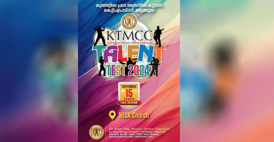 കുവൈത്ത് സിറ്റി : കുവൈത്ത് ടൗൺ മലയാളി ക്രിസ്ത്യൻ കോൺഗ്രിഗേഷൻ (കെടിഎംസിസി) സംഘടിപ്പിക്കുന്ന ടാലന്റ് ടെസ്റ്റ് സെപ്റ്റംബർ 15നു നടക്കും. എൻഇസികെ അങ്കണത്തിൽ രാവിലെ 8നു ആരംഭിക്കുന്ന മത്സരത്തിൽ മാർത്തോമ്മാ, സിഎസ്ഐ, ഇവാൻജലിക്കൽ, ബ്രദറൻ, പെന്തക്കോസ്ത് തുടങ്ങി 30 സഭകളിൽ നിന്നായി 500ലേറെ മത്സരിക്കും.