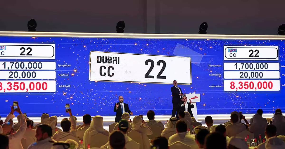 ശ്രദ്ധപിടിച്ചുപറ്റുന്ന കാർ നമ്പർ സ്വന്തമാക്കാനുള്ള ദുബൈയിലെ സമ്പന്നരുടെ മത്സരം പുതിയ റെക്കോർഡുകൾ താണ്ടുകയാണ്. കഴിഞ്ഞ രാത്രി ദുബൈ ഗ്രാൻഡ് ഹയാത്ത് ഹോട്ടലിൽ റോഡ് ട്രാൻസ്പോർട്ട് അതോറ്റി സംഘടിപ്പിച്ച ലേലത്തിൽ 90 നമ്പർ പ്ലേറ്റുകൾ ലേലത്തിൽ പോയത് ഏകദേശം 100 ദശലക്ഷത്തിലേറെ ദിർഹത്തിനാണ്. ഇതിൽ CC 22 എന്ന നമ്പറിനാണ് ഏറ്റവും വാശിയേറിയ ലേലം വിളി നടന്നത്. ഒടുവിൽ എൺപത്തി മൂന്ന് ലക്ഷത്തി അമ്പതിനായിരം ദിർഹത്തിന് അഥവാ 19 കോടി 40 ലക്ഷം രൂപക്കാണ് ഈ നമ്പർ ലേലത്തിൽ പോയത്. BB 20 എന്ന നമ്പറായിരുന്നു രണ്ടാം സ്ഥാനത്ത്. 75, 20,000 ദിർഹത്തിനാണ് ഈ നമ്പർ ആവശ്യക്കാർ കൊണ്ടുപോയത്. BB 19 എന്ന നമ്പർ 66,80,000 ദിർഹത്തിനും, AA 707 എന്ന പ്ലേറ്റ് 33,10,000 ദിർഹത്തിനും ലേലം വിളിച്ചെടുത്തു. AA 222 എന്ന നമ്പറിന് 33 ലക്ഷവും ലേലത്തിൽ കിട്ടി. മൊത്തം 98.83 മില്യൺ ദിർഹമാണ് ഒറ്റ രാത്രികൊണ്ട് ദുബൈ ആർ.ടി.എ ലേലത്തിൽ നിന്ന് നേടിയത്.