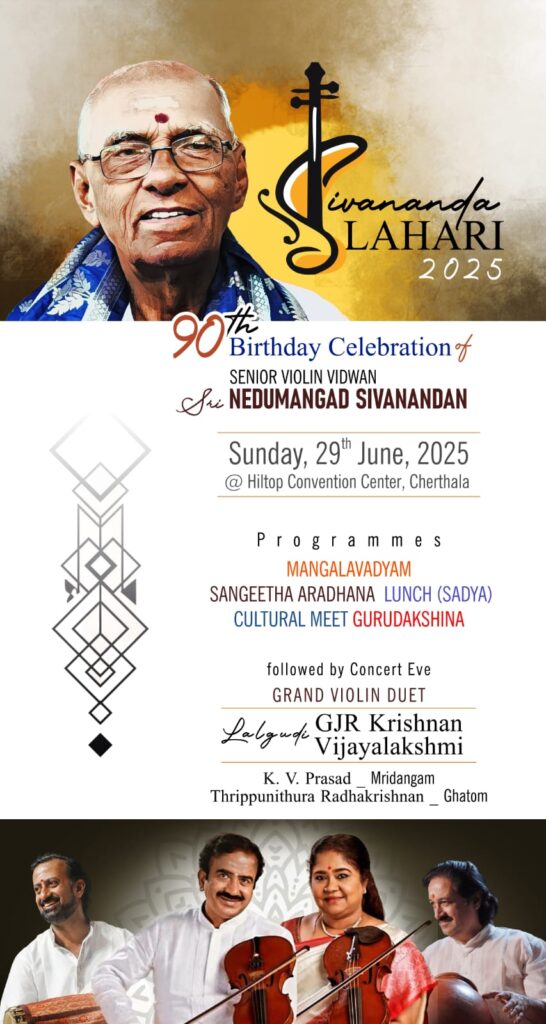 ചേർത്തല : കേരള സംഗീതലോകത്തെ മുതിർന്ന വയലിൻ വിദഗ്ധനായ നെടുമങ്ങാട് ശിവാനന്ദൻ നവതിയിലേക്ക് കടക്കുന്നതിനെ തുടർന്ന് അദ്ദേഹത്തിനായി ശിഷ്യരും സംഗീതപ്രേമികളും ചേർന്ന് ആദരാഘോഷം സംഘടിപ്പിക്കുന്നു. “ശിവാനന്ദലഹരി” എന്ന പേരിൽ സംഘടിപ്പിച്ചിരിക്കുന്ന ചടങ്ങ് ജൂൺ 29-ന് (ഞായർ) ചേർത്തല ഹിൽടോപ്പ് കൺവെൻഷൻ സെന്ററിൽ നടക്കും.