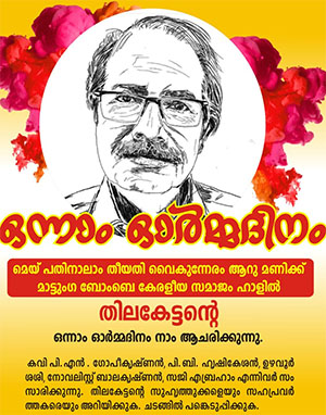 തിലകന്റെ ഒന്നാം ചരമ വാര്ഷിക ദിനം മാട്ടുംഗ കേരള ഭവനത്തില് അദ്ദേഹത്തിന്റെ കുടും ബാംഗങ്ങളും സുഹൃത്തുക്കളും ശിഷ്യന്മാരും അടങ്ങിയ സദസില് ആചരിച്ചു. അദ്ദേഹത്തി ന്റെ വേര്പാട് സൃഷ്ടിച്ച ആഘാതം ഒരു വര്ഷത്തിനു ശേഷവും സുഹൃത്തുക്കളില് പ്രക ടമാ യിരുന്നു. ഇഎ സ്നോടൊപ്പം ദീര്ഘകാലം ഡെക്കോറ എന്ന തീവ്ര ഇടതു നിലപാട് മുന്നോ ട്ടു വെച്ച സാംസ്കാരിക സംഘടനയില് പ്രവര്ത്തിച്ച പി എന് സനാതനന് സ്വാഗതം പറഞ്ഞു.