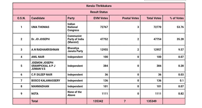 തൃക്കാക്കരയിലെ അന്തിമ വോട്ടുനില :