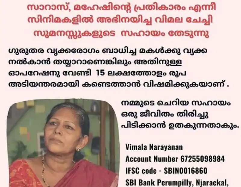 നടി വിമല നാരായണന്റെ മൂത്തമകളാണ് രണ്ട് വൃക്കകളും തകരാറിലായി ചികിത്സ കാത്ത് കഴിയുന്നത്. ശസ്ത്രക്രിയക്കും മറ്റുമായി 15 ലക്ഷത്തോളം രൂപ അടിയന്തരമായി കണ്ടെത്താ ന് വിഷമിക്കുകയാണ് കുടുംബം