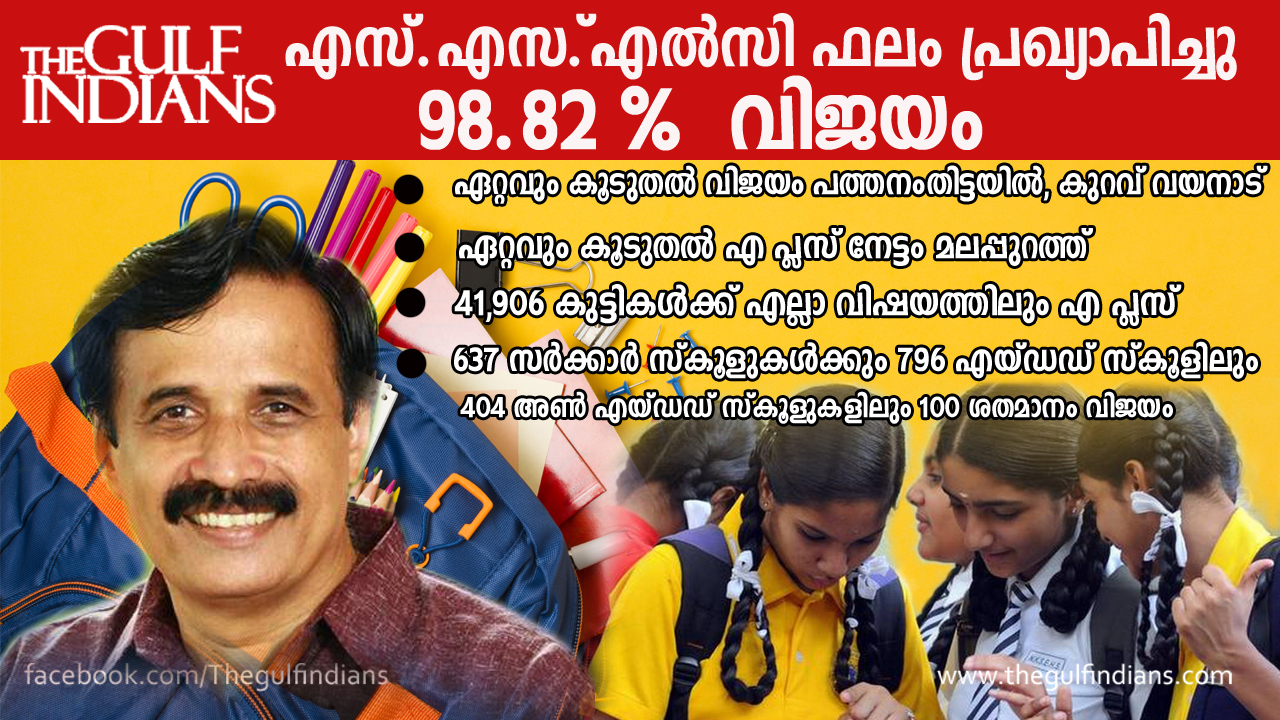 എസ്എസ്എൽസി ഫലം പ്രഖ്യാപിച്ചു. ഇന്ന് ഉച്ചയ്ക്ക് രണ്ടുമണിക്ക് വിദ്യാഭ്യാസ വകുപ്പ് മന്ത്രി സി. രവീന്ദ്രനാഥ് ആണ് എസ്എസ്എൽസി ഫലം ഔദ്യോഗികമായി പ്രഖ്യാപിച്ചത്. എസ്എസ്എൽസിക്ക് 98.8 2 ശതമാനം വിജയം . കുട്ടനാട് വിദ്യാഭ്യാസ ജില്ലയ്ക്ക് 100% വിജയം. ഇതോടൊപ്പം ടി എച്ച് എസ് എൽ സി, എ എച്ച് എസ് എൽ സി , ഹിയറിങ് ഇംപയേഡ്, ടി എച്ച് എസ് എൽ സി, തുടങ്ങിയവയുടെ ഫലങ്ങളും പ്രസിദ്ധീകരിച്ചു.